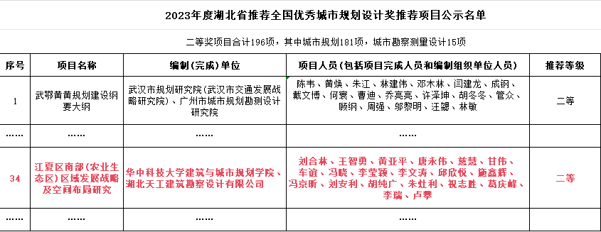 2023年11月30日,湖北省城市規(guī)劃協(xié)會公示了2023年度湖北省推薦全國優(yōu)秀城市規(guī)劃設(shè)計獎推薦項目名單,湖北天工建筑勘察設(shè)計有限公司聯(lián)合華中科技大學(xué)完成的“江夏區(qū)南部(農(nóng)業(yè)生態(tài)區(qū))區(qū)域發(fā)展戰(zhàn)略及空間布局研究”項目榮獲二等獎,并計劃申報國家級獎項?。ㄗ迦耍豪铈拢?/p>